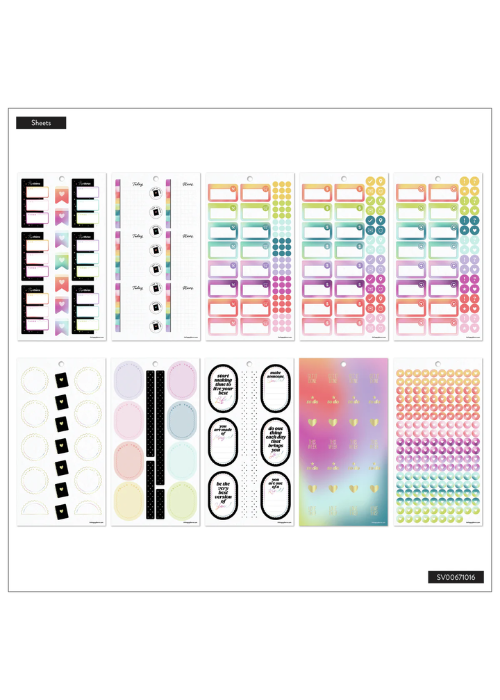 Esta edición especial incluye 950 stickers en 30 hojas, llenos de frases inspiradoras, etiquetas funcionales, íconos decorativos y acentos holográficos inspirados en nuestra paleta original de arcoíris. A lo largo del libro encontrarás nuestros característicos discos en forma de corazón, un guiño al camino que dio inicio a todo.